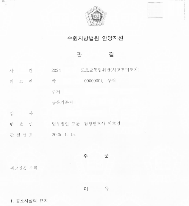 수원교통사고변호사가 억울하게 사고후미조치(뺑소니)로 기소되어 처벌위기에 놓인 의뢰인에게 조력하여 무죄 판결을 받아낸 사례