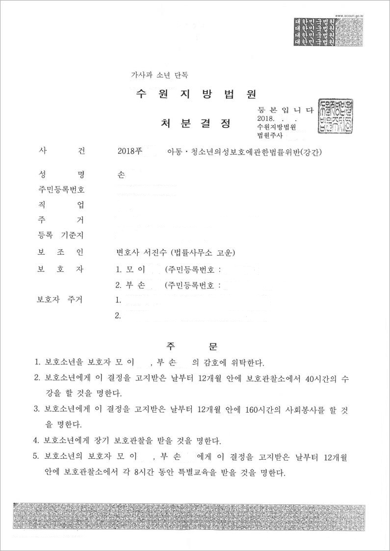 그러나 법무법인 고운은 보호소년과 피해자의 입장을 모두 조심스럽게 설명하여, 피해자와의 합의를 이끌어 냈고 동시에 보호소년에게 유리한 정상관계를 부각시켜 '보호소년을 보호자의 감호에 위탁한다'는 1호 처분을 받았습니다.