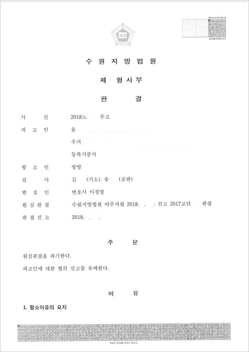 항소심 재판부는 법무법인 고운의 이 같은 주장을 일부 받아들였고, 그 결과 의뢰인에 대하여 원심 판결을 취소하고, 형의 선고를 유예한다는 최상의 결과를 얻었습니다.