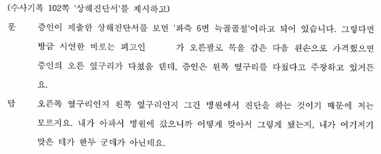 이외에도 담당변호사는 갈비뼈 골절 경위에 대해 구체적으로 물으면서, A의 진술의 모순을 계속 끌어내었습니다. 이후 증인신문을 마친 법무법인 고운은 A가 거짓말을 하고 있다는 점을 일목요연하게 정리하여 변호인의견서로 제출하였습니다.