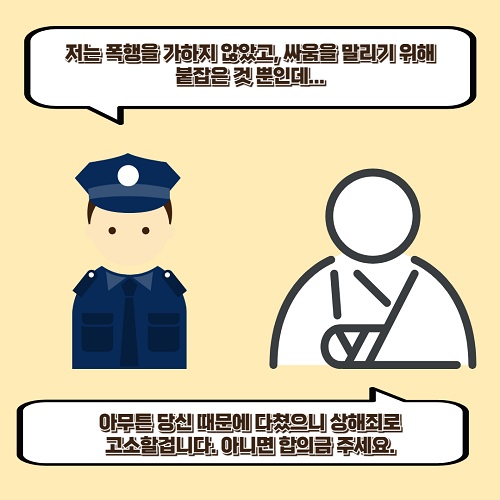 A는 다른 관리사무소 직원의 신고로 출동한 경찰관에게, 의뢰인으로부터 폭행을 당하였다며 적반하장격으로 의뢰인을 신고하였고, 다음 날에는 의뢰인의 폭행으로 인해 갈비뼈가 골절되었다며, 전치 4주 상해진단서를 끊어 경찰서에 제출하며 의뢰인을 상해죄로 고소하였습니다.