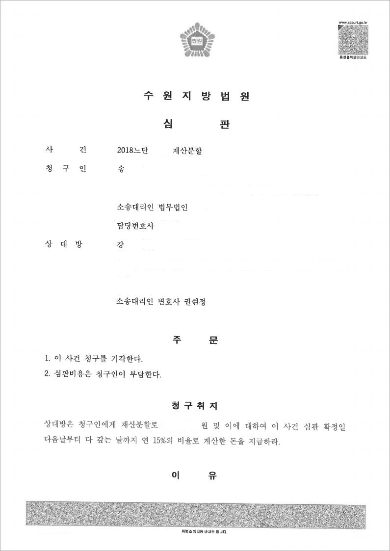 법무법인 고운은 의뢰인의 입장에서 적극적으로 재판에 임하여 주장을 하였고, 재판부가 이를 받아들여 청구인이 의뢰인을 상대로 한 재산분할 청구에 대하여 결국 기각되었습니다.