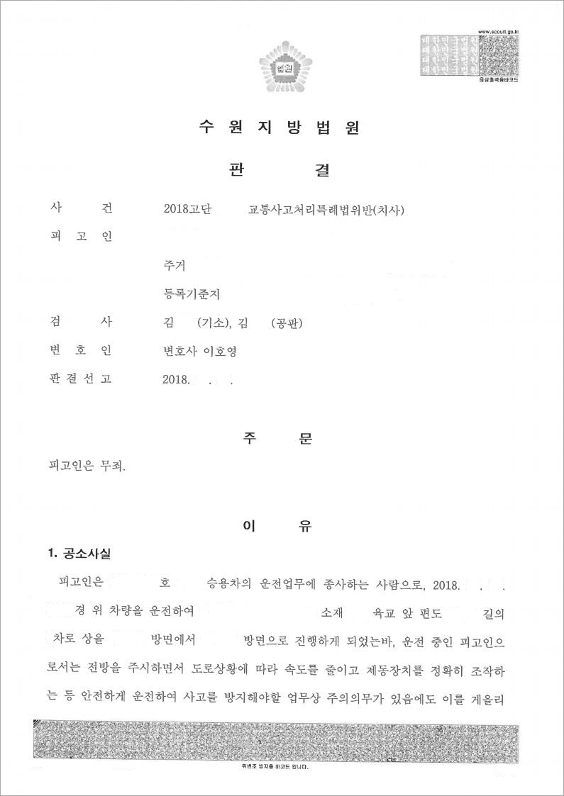 저희 법무버인 고운은 사고 당시의 블랙박스 영상을 분석하여, 사고 당시 도로가 어두워 시야가 제대로 확보되기 힘든 상황이었고, 피해자가 당시 어두운 옷을 입고 있어 미리 발견하기 어려웠으며, 사고 부근에 육교가 있어 사람이 도로를 횡단할 것이라 예측하기도 어려웠다는 사정등을 적극적으로 변론하여 결국, 1심 재판부로부터 무죄판결을 선고받았습니다.