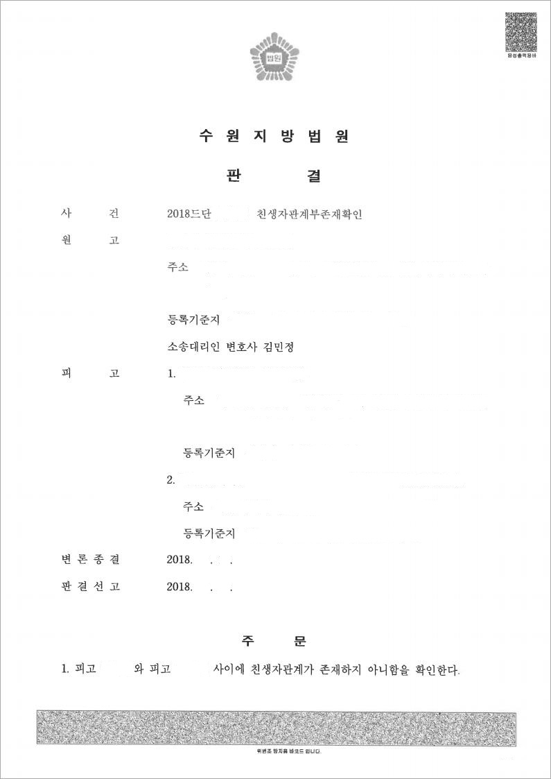 이에 저희 법무법인 고운에서는 의뢰인의 가족관계등록부 정정을 위하여 의뢰인을 대리하여 아들의 가족관계등록부상 모와 아들 사이에 친생자관계가 존재하지 않는다는 사실과 의뢰인과 아들 사이에 친생자관계가 존재한다는 사실을 확인받기 위하여 소송을 제기하였습니다.