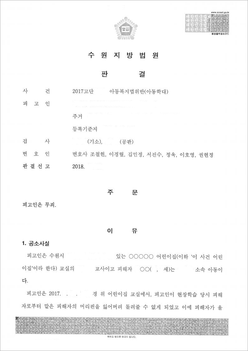 재판부에서는 이 같은 변호인의 주장을 받아들여, 결국 피고인에 대하여 무죄 선고하였습니다.