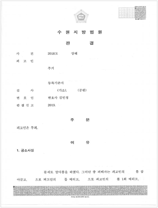 법무법인 고운은 상해에 이르지 않는 다는 부분 등을 증거기록과 추가 입증자료를 통해 적극적으로 주장 입증하였고, 증인신문과정을 통해 피고인의 정당방위 주장을 하였습니다. 그리고 재판부는 이 같은 주장을 받아들여 의뢰인의 ‘무죄’ 를 선고했습니다.
