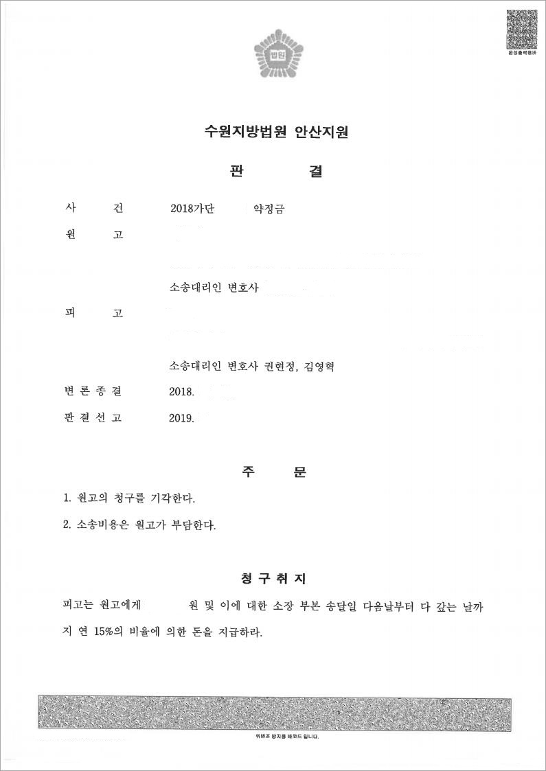 저희 법무법인 고운은 계약서 검토 결과 의뢰인의 전부승소도 가능하다는 판단을 하였고, 적극적인 법리검토, 추가 증거수집을 통해 투자금 반환 약정이 없었다는 주장을 하였습니다. 상대방인 원고는 이에 대해 추가적인 주장을 하였으나, 법무법인 고운은 원고의 주장을 하나 하나씩 반박하였고, 결국 재판부로부터 원고의 청구기각(전부승소) 판결을 받게 되었습니다.