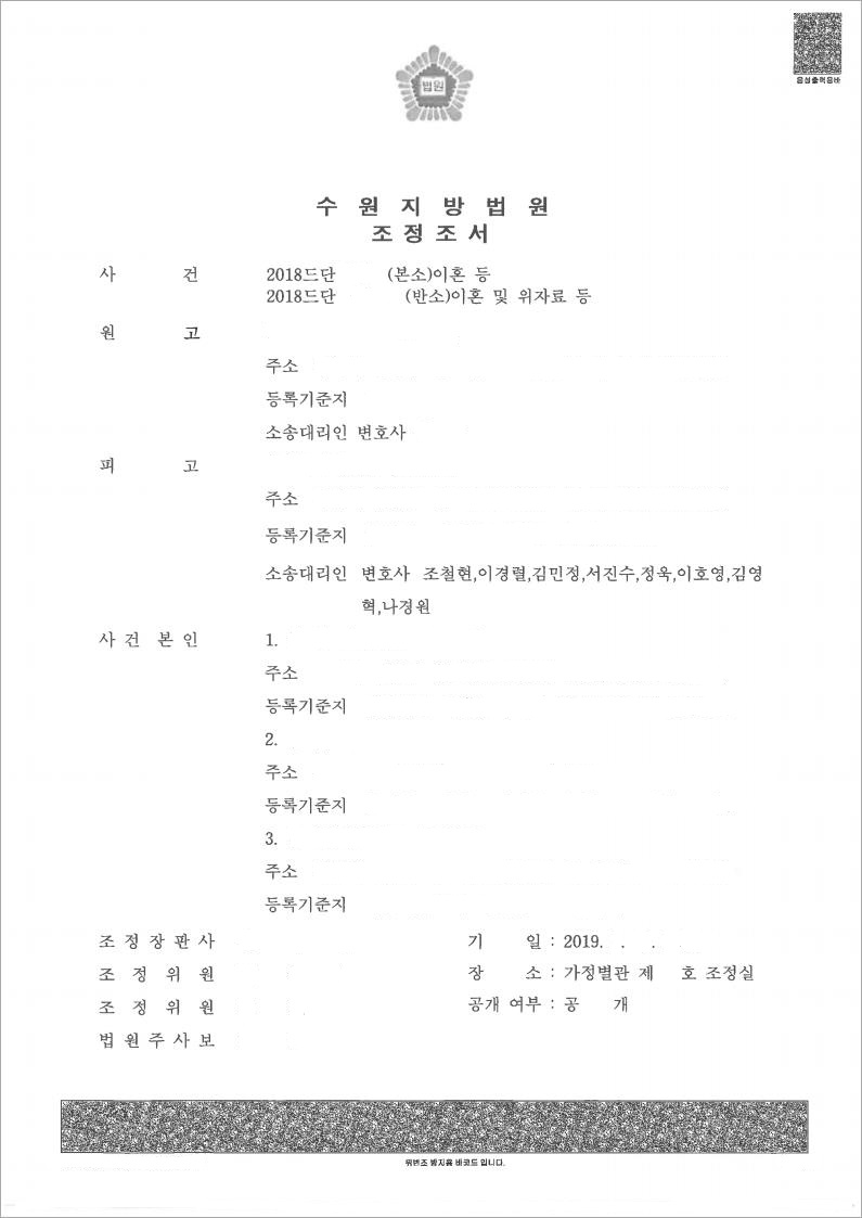 재판부는 상호간의 서면과 주장사항을 검토한 결과, 의뢰인에게 유리하게 판단해 주었고, 결국 조정기일에서 사건본인들에 대한 친권자 및 양육자 부분을 의뢰인이 지정되었으며, 재산분할과 양육비도 지급 받게 되어 의뢰인이 매우 만족하였습니다.