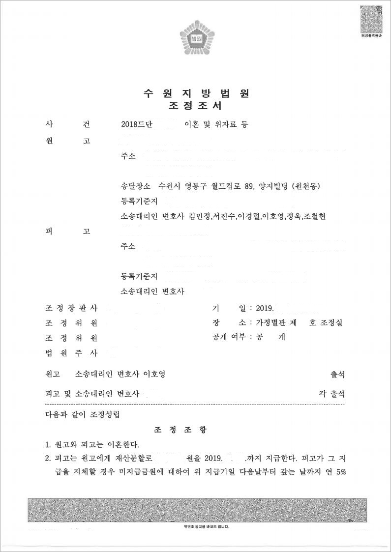 결국, 조정기일에 의뢰인 주장에 대하여 유리하게 인정되어 청구한 재산분할 금액 대부분을 지급하라는 조정을 이끌어 내어 의뢰인 만족스러워 하였습니다.