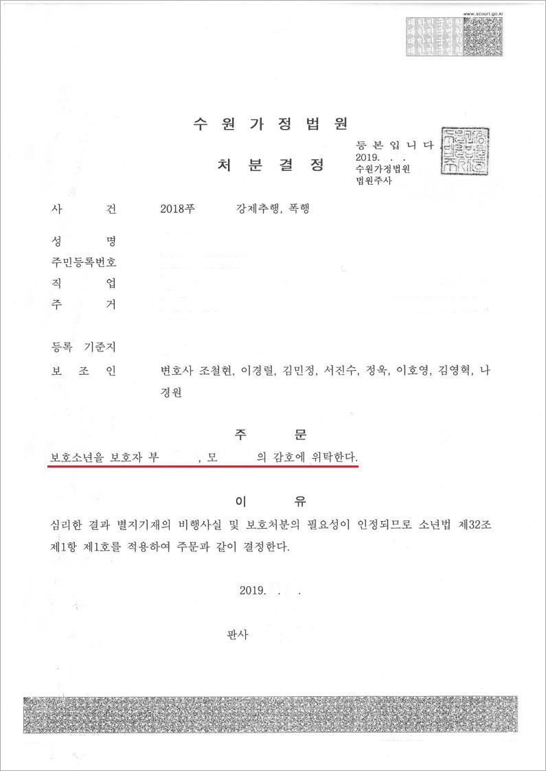 재판부는 대리인의 위와 같은 주장을 받아들였고, 의뢰인인 학생은 가장 가벼운 처분인 1호처분(가정내에서 부모님이 교육하는 방식)을 받게 되었습니다. 의뢰인은 위 결과에 매우 만족하였습니다.