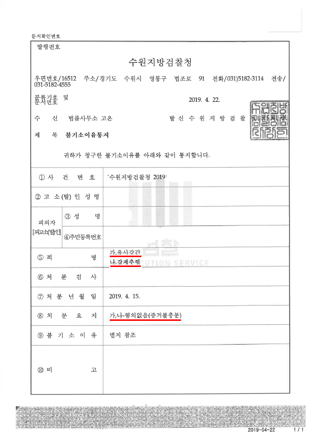 검찰은 결국 대리인의 주장을 받아들여 의뢰인에 대한 "유사강간 및 강제추행"은 혐의없음 으로 사건을 종결 하였으며, 의뢰인도 위 결과에 매우 만족하셨습니다.