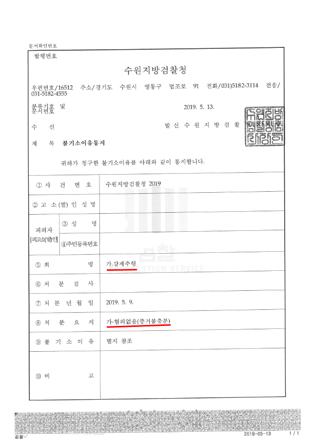위 사건에 대해 검찰은 본 변호인의 변호를 받아들여 혐의없음으로로 사건을 종결하였습니다.
