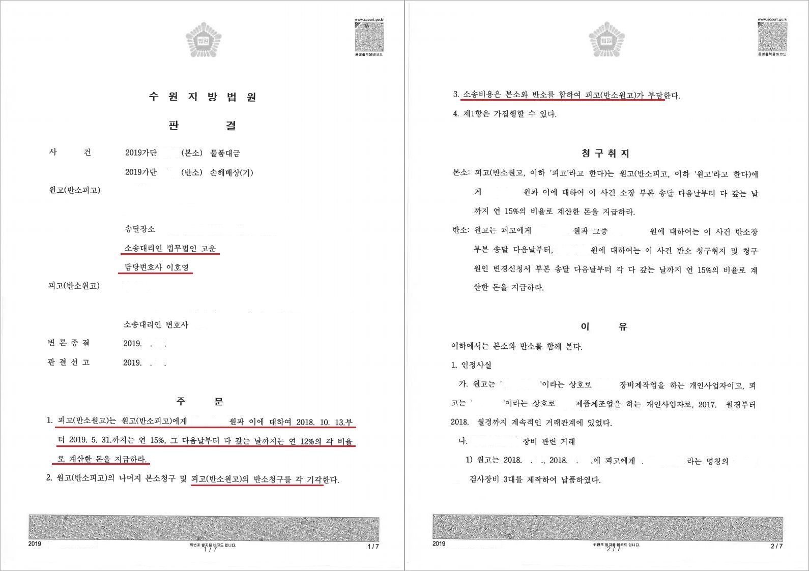 결국 재판부는 법무법인 고운 측의 주장을 전부 받아들였으며, 의뢰인 A씨는 B씨로부터 물품대금 전액을 지급받기로 하는 승소 판결이 선고되었고, B씨의 손해배상 청구부분은 전부 기각되어 의뢰인이 사건 결과에 대하여 매우 만족하였습니다.