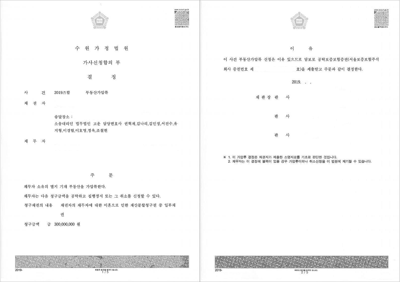 결국 가사신청 재판부는 법무법인 고운 측의 주장을 받아들여 부동산가압류 신청 3일만에 가압류결정이 나왔으며, 가압류등기까지 이루어져 재산확보가 되었고, 의뢰인은 위와 같이 빠른 보전처분에 대하여 매우 만족하였습니다.