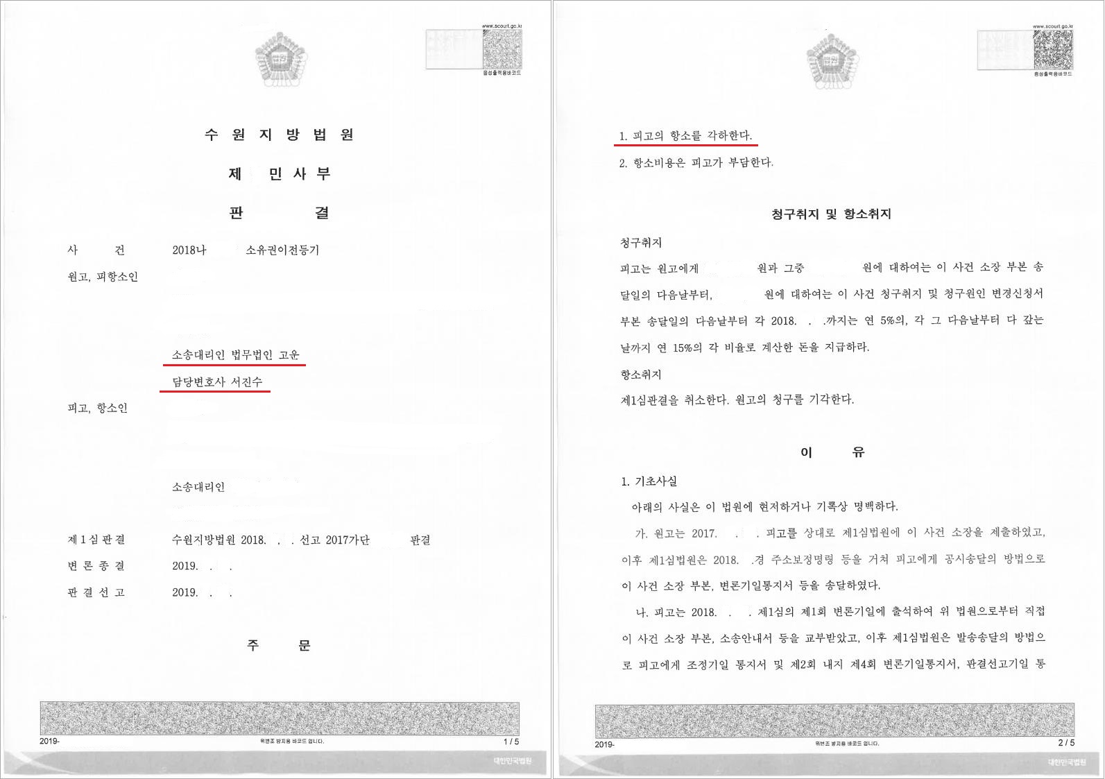 법무법인 고운은 1심 소송과정에서 B씨가 소장 부본 송달을 적법하게 받은 부분과 항소기간을 경과한 부분이 당사자가 책임질 수 없는 사유에 해당하지 않는 등의 대법원판례를 들으며 적극적인 변론으로 재판부를 설득하였습니다.