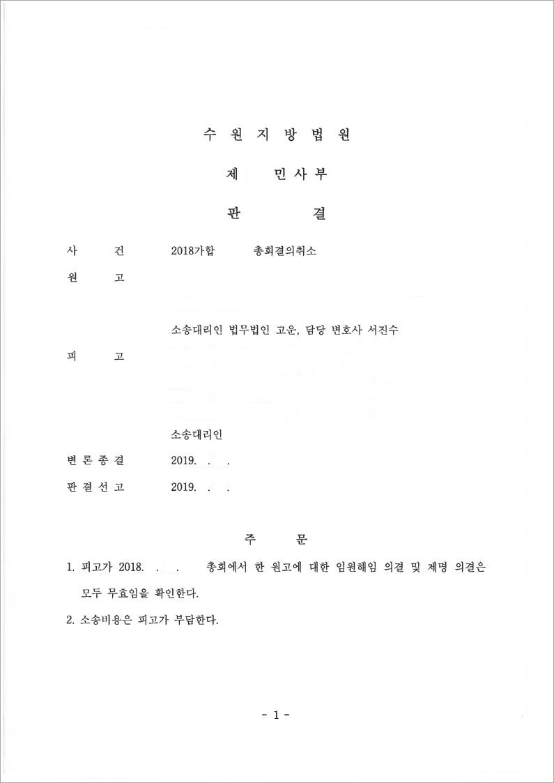결국 법원 재판부는 법무법인 고운 측의 주장을 받아들여 B가 총회에서 의뢰인 A씨에 대한 임원해임 의결 및 제명 의결은 모두 무효임을 확인한다는 판결이 선고 되어 전부 승소하게 되었으며, 의뢰인은 판결에 매우 만족하였습니다.