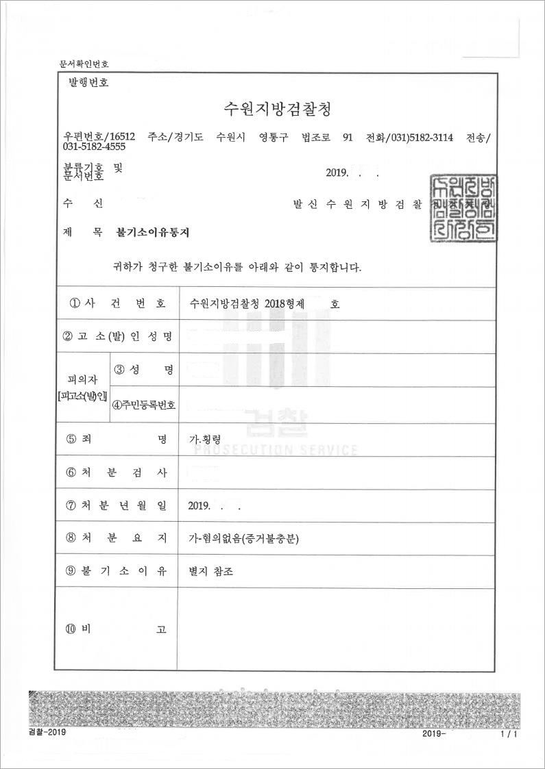 법무법인 고운은 의뢰인에 입장에서 수사기관에 적극적으로 변호를 하였으며, 수사기관에 여러 차례 변호인의견을 개진한 결과, 검찰로부터 의뢰인에 대한 혐의없음(증거불충분) 처분을 받게 되었습니다.
