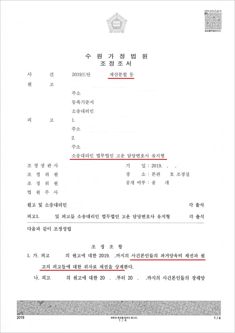 재판부는 법무법인 고운의 주장을 받아 들였으며, 결국 조정절차에서 B씨가 A씨에게 지급하지 않은 과거양육비와 장래양육비를 감안하여 B씨가 청구한 위자료와 재산분할 부분은 없는 것으로 하였고, 오히려 B씨가 A씨에게 아이에 대한 장래양육비 일부금액을 지급하는 것으로 조정이 성립되었습니다. 의뢰인은 위 조정결정에 매우 만족을 하였습니다.