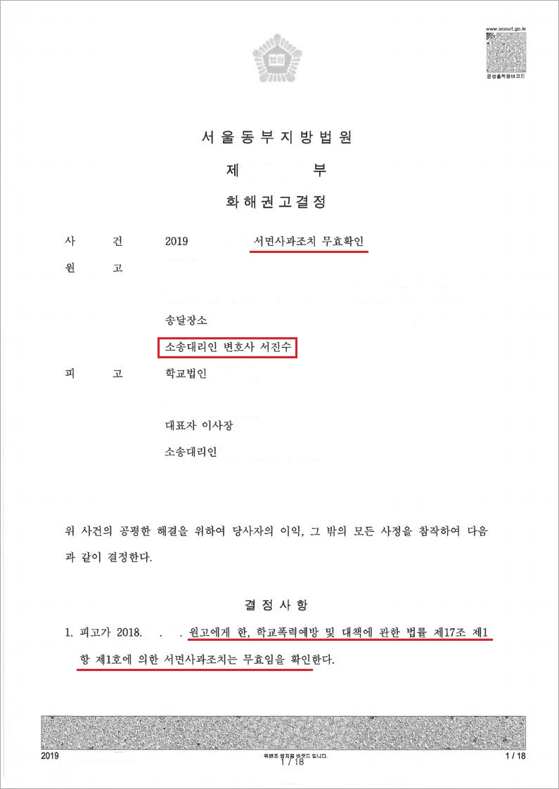 재판부는 법무법인 고운의 주장을 받아 들였고, 결국 학교측에 학교폭력예방 및 대책에 관한 법률 제17조 제1항 제1호에 의한 서면사과조치는 무효임을 확인하는 결정을 하였고, 사건이 그대로 확정 되었습니다. A학생의 부모님은 위 결정에 매우 만족을 하였습니다.
