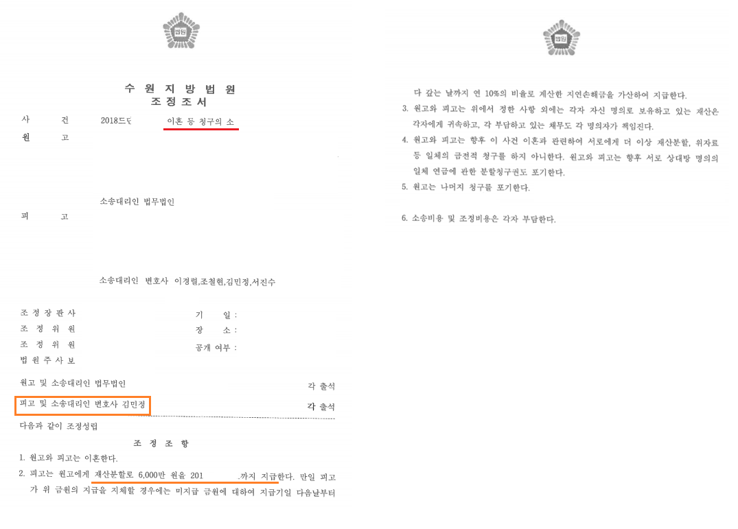본 사건은 의뢰인이 유책배우자라는 점 등 여러 불리한 사정이 있었으나, 조정기일에서 의뢰인 A씨가 위자료를 지급하지 않기로 하고 또한 재산분할 금액도 대폭 감액하는 내용으로 조정이 이루어졌고, 특히 의뢰인의 공무원연금에 대해서도 상대방 배우자가 분할을 청구하지 않기로 하는 유리한 내용으로 조정을 성립시켰습니다.