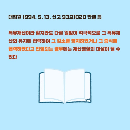 이에 대하여 우리 법원은 “특유재산이라 할지라도 다른 일방이 적극적으로 그 특유재산의 유지에 협력하여 그 감소를 방지하였거나 그 증식에 협력하였다고 인정되는 경우에는 재산분할의 대상이 될 수 있다(대법원 1994. 5. 13. 선고 93므1020 판결 등)”고 판시하면서, 실무상으로는 부부일방이 상속받은 재산이라 하더라도, 혼인공동생활기간 중에 취득한 재산이고 그것이 유지되고 있다면, 부부공동이 그 형성과 유지에 기여한 것으로 평가하여 재산분할의 대상으로 산입하고 있습니다.
