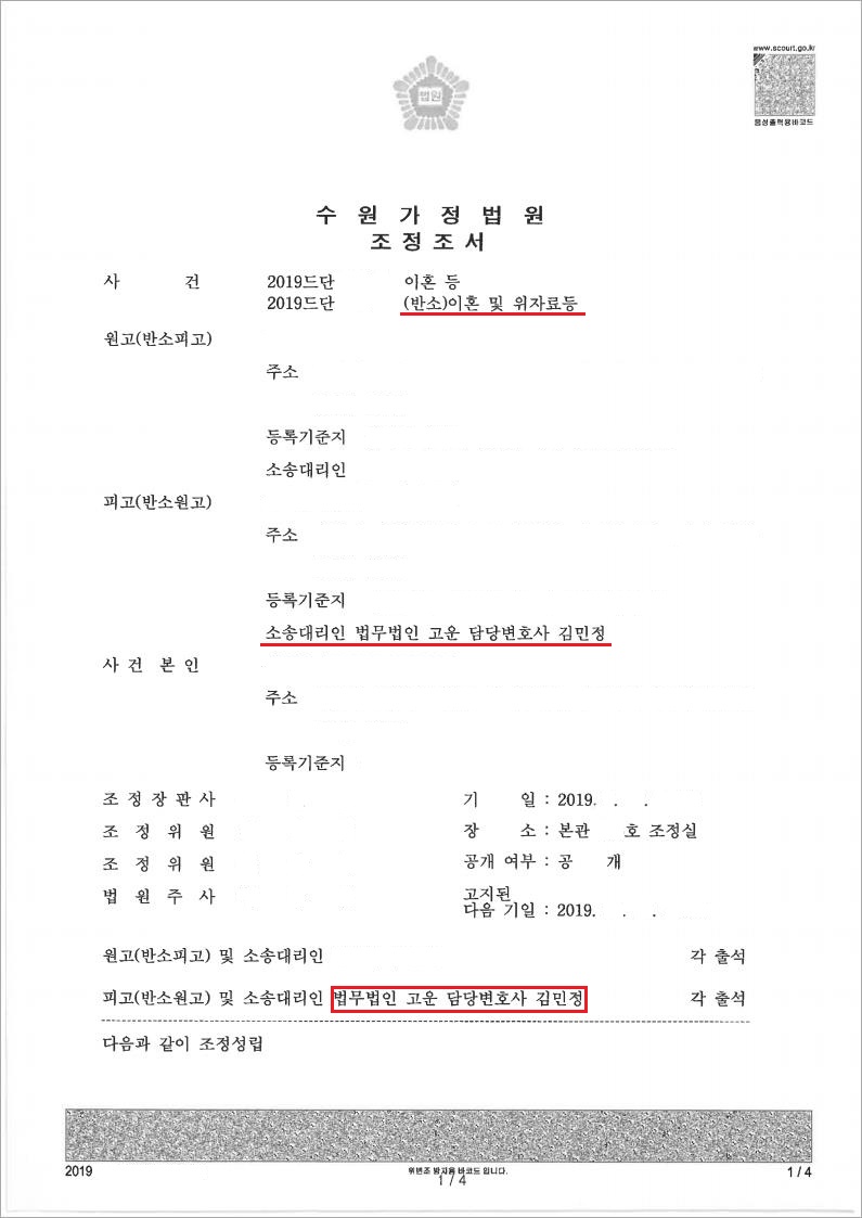 이에 저희 법무법인 고운은 의뢰인 A씨의 주장을 적극 피력하였고, 조정절차를 통하여 결국 A씨가 위자료를 지급하지 않기로 하고, B씨가 청구한 양육비에서 약 30%를 감액한 금액으로 양육비를 지급하는 것으로 원만히 조정을 성립시켰습니다.