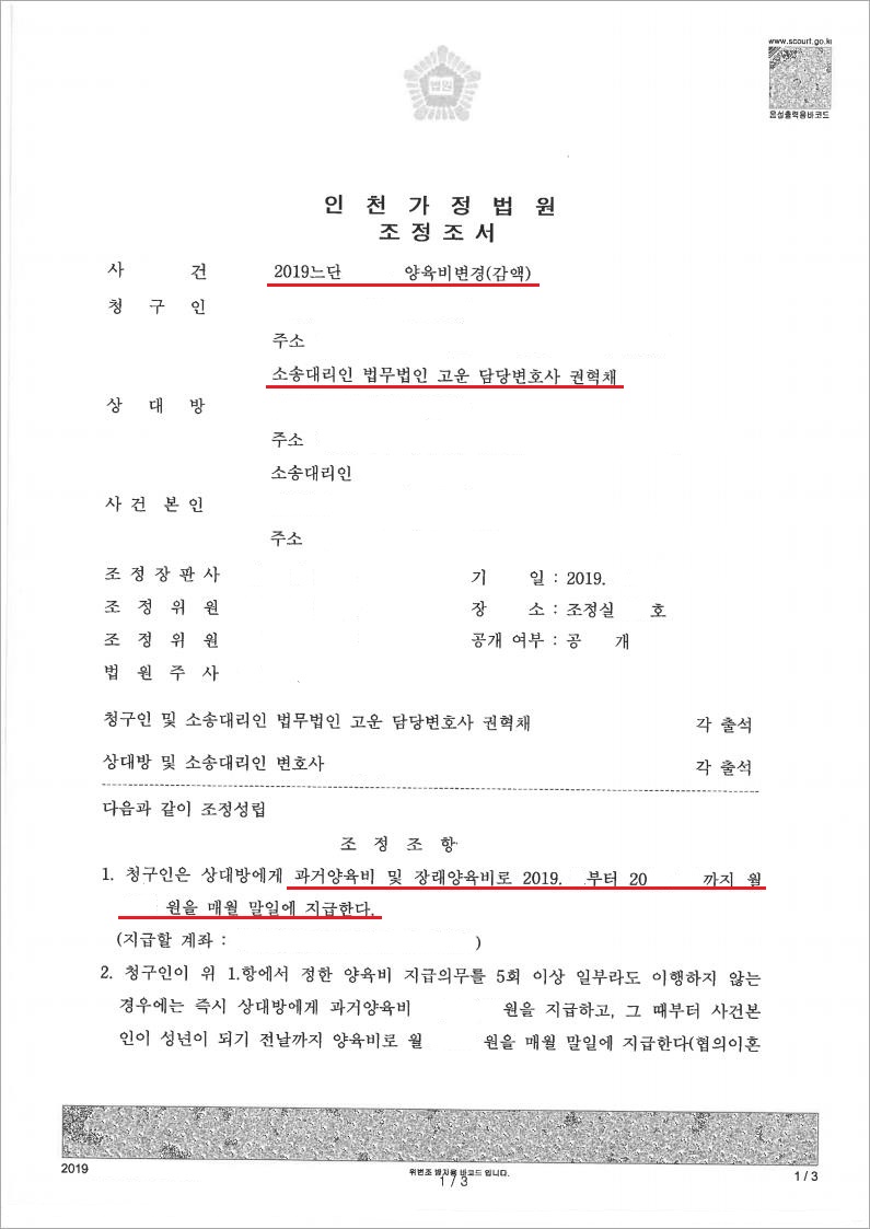 양육비의 감액을 구하는 양육비변경 사건의 경우, 이혼을 하면서 이미 정해진 양육비 금액이 있는 데다, 양육비는 자녀의 생계와 관련한 필수적인 돈이라는 특성이 있어, 특별한 사정이 없다면 기존의 양육비를 감액 변경하는 것이 매우 어렵습니다. 이에 저희 법무법인 고운은 의뢰인 A씨의 사정이 양육비를 감액 변경할 필요성이 있는 특별한 사유에 해당한다는 점에 대하여 적극적으로 주장하였고, 결국 조정기일에서 과거양육비 전액을 감액 받고, 또한 매월 지급해야 할 장래양육비를 30% 감액하기로 하는 유리한 내용으로 조정을 성립시켰습니다.