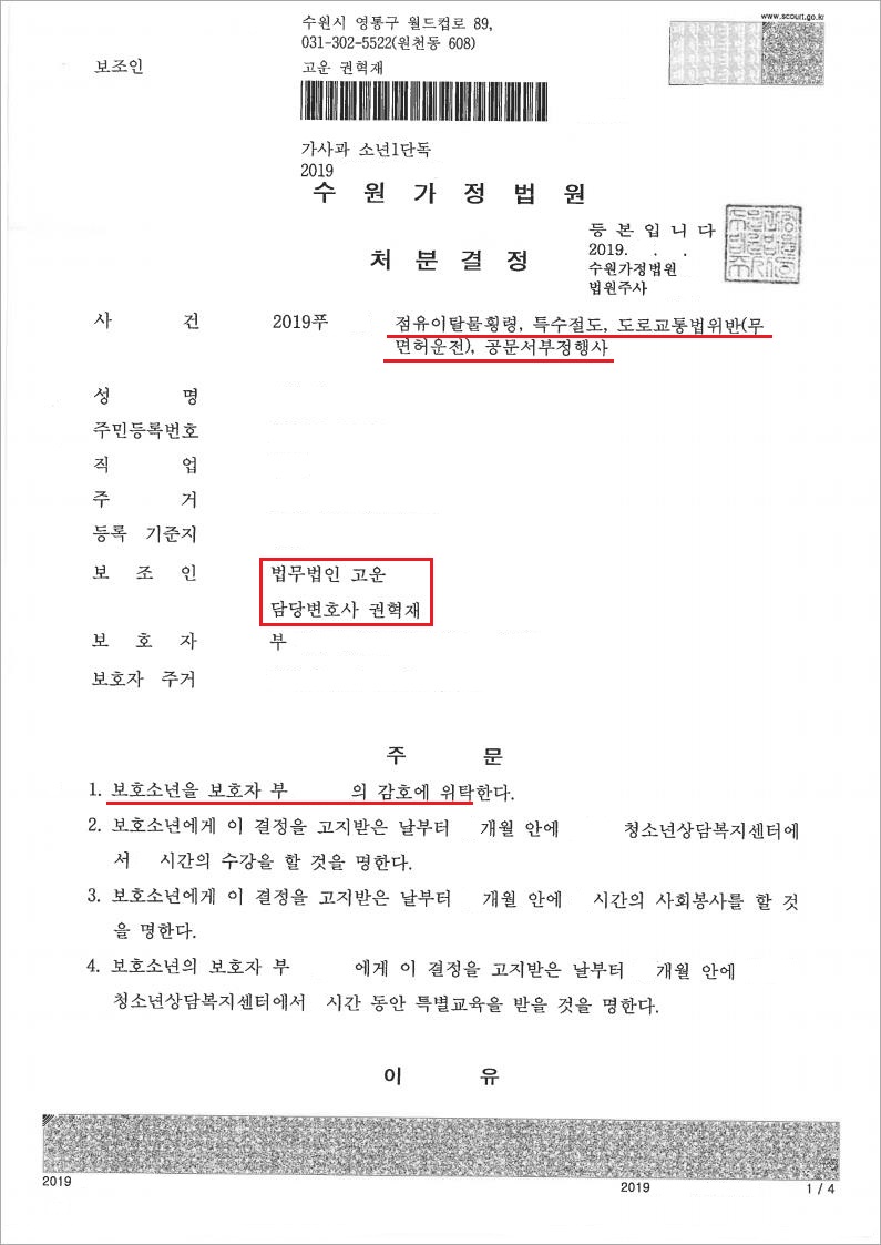 재판부는 대리인의 위와 같은 주장을 받아들였고, 보호소년에 대하여 1호처분(보호자가 교육하는 방식)과 특별교육 수강하는 명령을 내렸습니다. 의뢰인은 위 결과에 매우 만족하였습니다.
