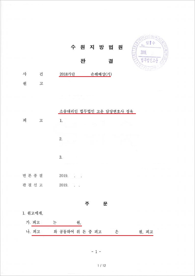 법무법인 고운은 의뢰인이 그 동안 피해를 본 손해금액에 대하여 적극적인 변론을 통해 입증을 하였고, 결국, 민사 재판부로부터 피해금액 전부를 배상하라는 전부 승소 판결을 얻을 수 있었습니다.