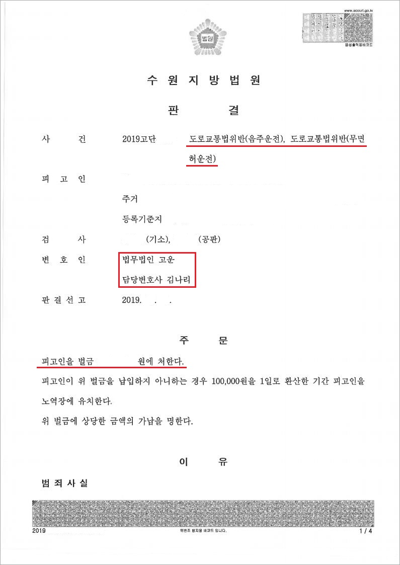 법무법인 고운은 재판부에 이 사건 범행을 모두 인정하면서 잘못을 뉘우치고 있는 점, 의뢰인 A씨가 동종범죄 1회의 벌금 전과 이외에는 처벌전력이 없는 점, A씨가 징역형을 선고 받게 되면 자녀를 양육하고 있는 A씨의 가정이 경제적으로 큰 어려움에 처하며 정상적인 가정을 유지할 수 없다는 사정을 재판부에 간절히 호소하였습니다.