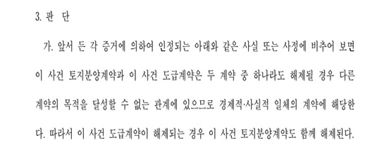 재판부는 판결이유에서, "이 사건 토지분양계약과 이 사건 도급계약은 두 계약 중 하나라도 해제될 경우 다른 계약의 목적을 달성할 수 없는 관계에 있으므로 경제적·사실적 일체의 계약에 해당한다. 따라서 이 사건 도급계약이 해제되는 경우 이 사건 토지분양계약도 함께 해제된다"고 명확히 판시했습니다.