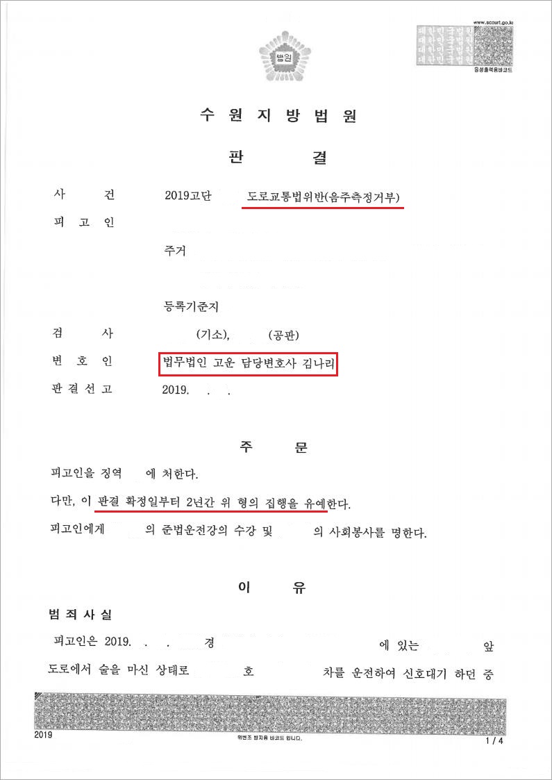 법무법인 고운은 의뢰인 A씨에 대하여 범행사실을 모두 인정, 반성하는 태도로 변론을 하였으며, 동종전과가 이 사건 범행 오래전에 발생한 점과 사고가 발생하지 않은 점을 강조하였고, A씨에 대한 유리한 정상부분을 적극적으로 변호하였습니다.