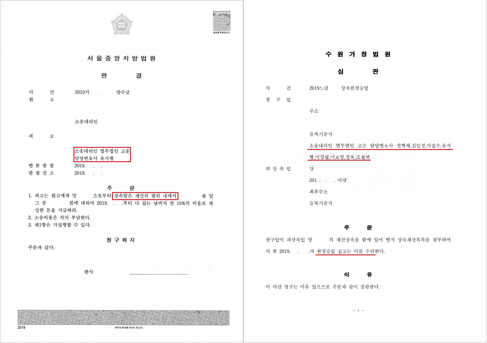 법무법인 고운은 재판부로부터 A씨의 한정승인 신고를 수리한다는 심판을 받았으며, 결국, B씨가 청구한 양수금 청구에서도 상속받은 재산의 범위 내에서 청구금액을 지급하라는 판결이 선고되었습니다.
