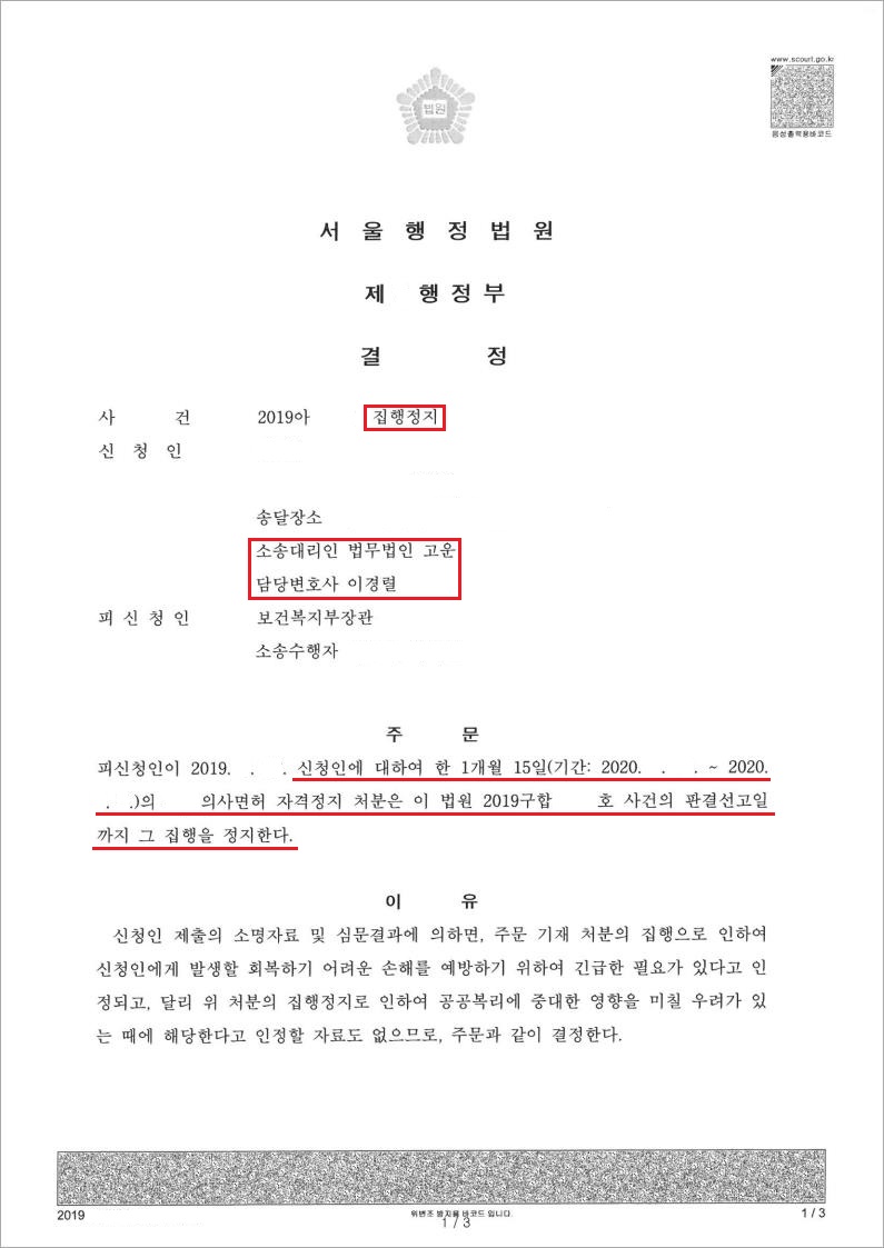 법원 재판부는 법무법인 고운의 주장을 받아들였고, 결국 A씨에게 의사면허 자격정지 처분에 대하여 집행을 정지하는 결정을 이끌어 냈습니다.