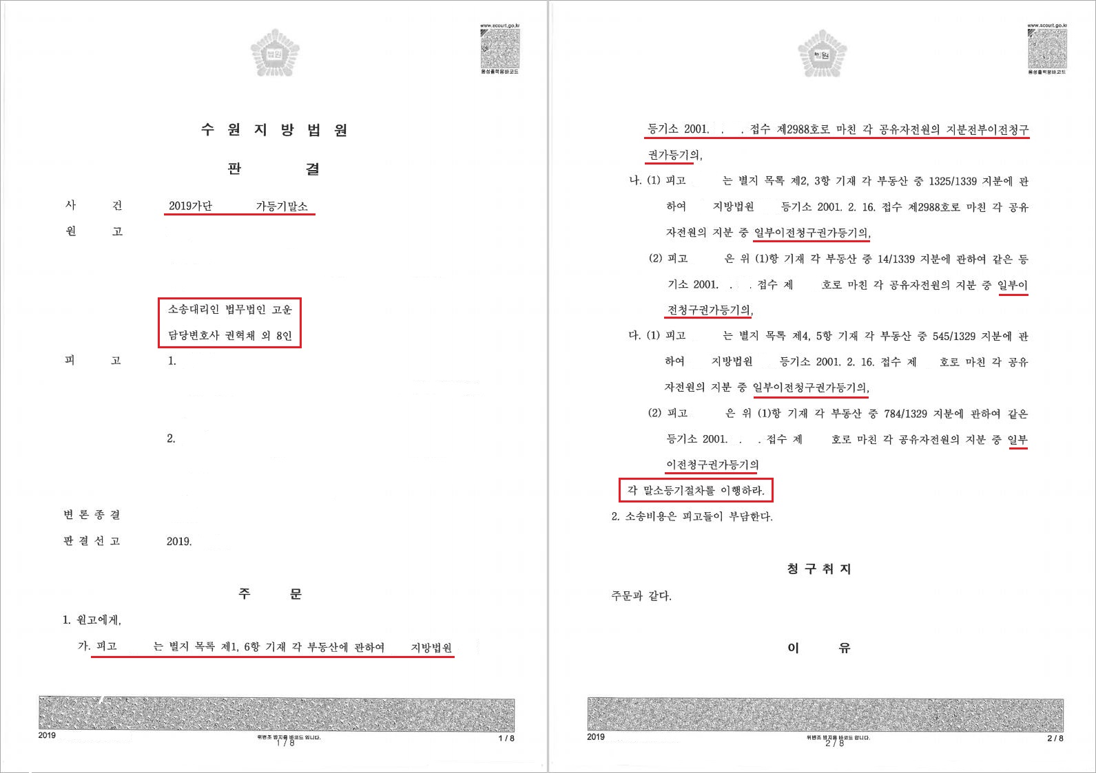 재판부는 법무법인 고운의 주장을 전부 받아들였고, 결국 C씨와 D씨를 상대로 설정되어 있던 가등기를 모두 말소하라는 판결을 선고하였고, 전부승소 판결을 이끌어 냈습니다.