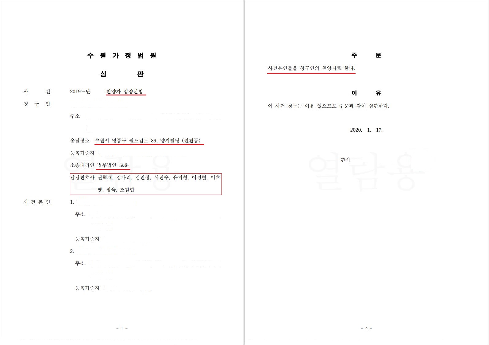 친양자 입양이 되면 자녀들과 친부와의 가족관계가 소멸하게 되므로 입양 요건이 더욱 엄격하고, 그래서 입양에 대한 친부의 동의를 받기가 어려운 사건입니다. 이에 저희 법무법인 고운은 친양자 입양 신청이 받아들여지고 또한 입양 절차가 조속하게 진행될 수 있도록 자녀들의 친부와 의견 조율을 하여 원만히 친양자 입양에 관한 동의를 이끌어 냈고, 그 결과 재판이 신속하게 진행되어 A씨의 자녀들이 B씨의 친양자로 인정받는 결과를 받게 되었습니다.