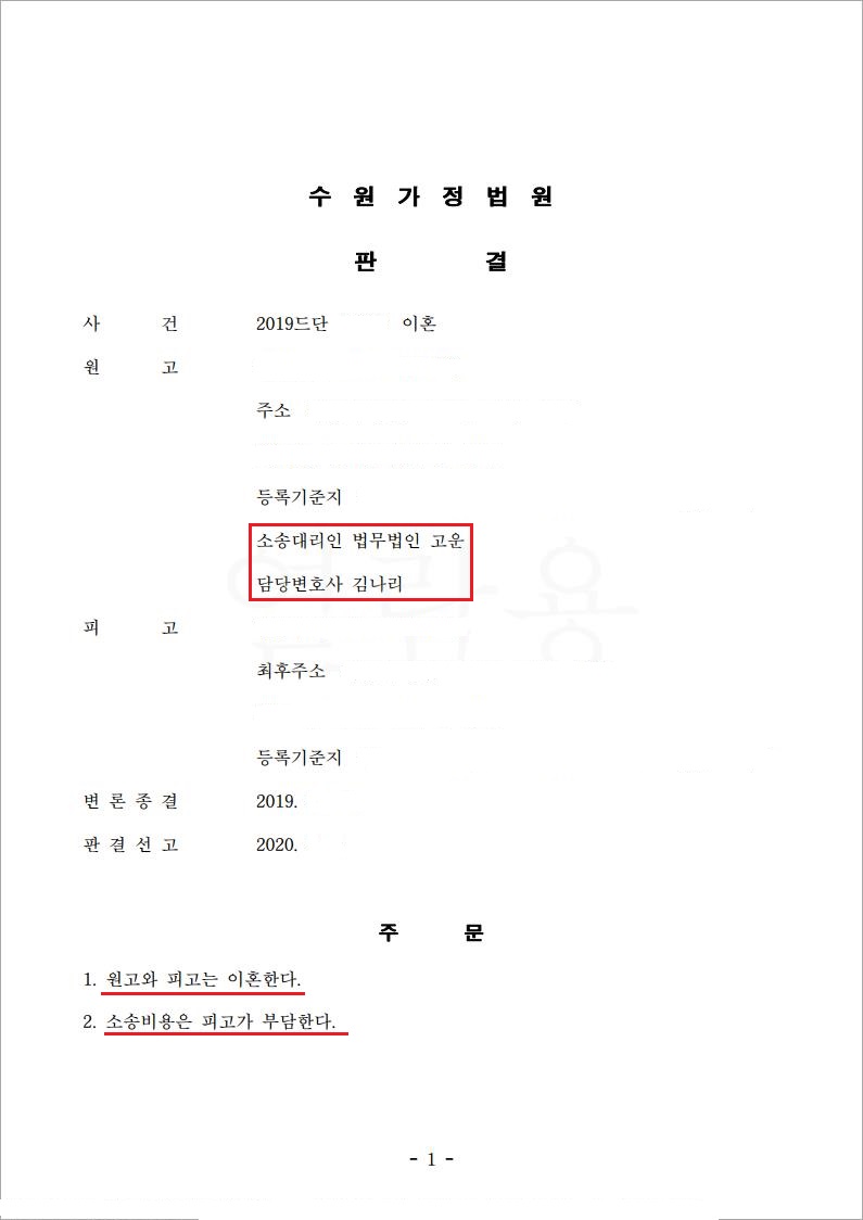 이에 저희 법무법인 고운은 곧바로 B씨를 상대로 이혼 소송을 제기하였고, B씨의 거주지를 알지 못하여 소송 서류 송달 등에 지연이 생길 수밖에 없는 상황이었으나, 혼인관계 파탄 등을 입증하여 조속히 이혼 판결을 받을 수 있었습니다.