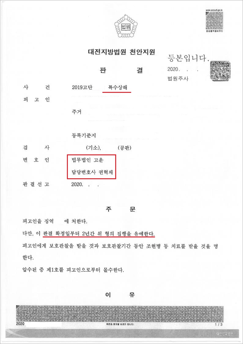 법원은 A씨의 심심미약 주장 부분과 진심으로 반성을 하고 있는 점, 피해자와 원만히 합의하였다는 점을 참작하여 결국, 의뢰인 A씨에 대하여 집행유예 판결을 선고하였고, 의뢰인은 위 판결에 매우 만족하였습니다.