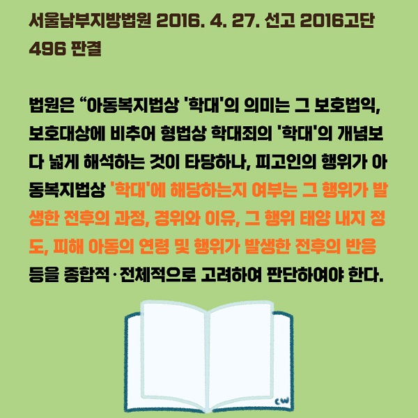 법원은 “아동복지법상 '학대'의 의미는 그 보호법익, 보호대상에 비추어 형법상 학대죄의 '학대'의 개념보다 넓게 해석하는 것이 타당하나, 피고인의 행위가 아동복지법상 '학대'에 해당하는지 여부는 그 행위가 발생한 전후의 과정, 경위와 이유, 그 행위 태양 내지 정도, 피해 아동의 연령 및 행위가 발생한 전후의 반응 등을 종합적·전체적으로 고려하여 판단하여야 한다.