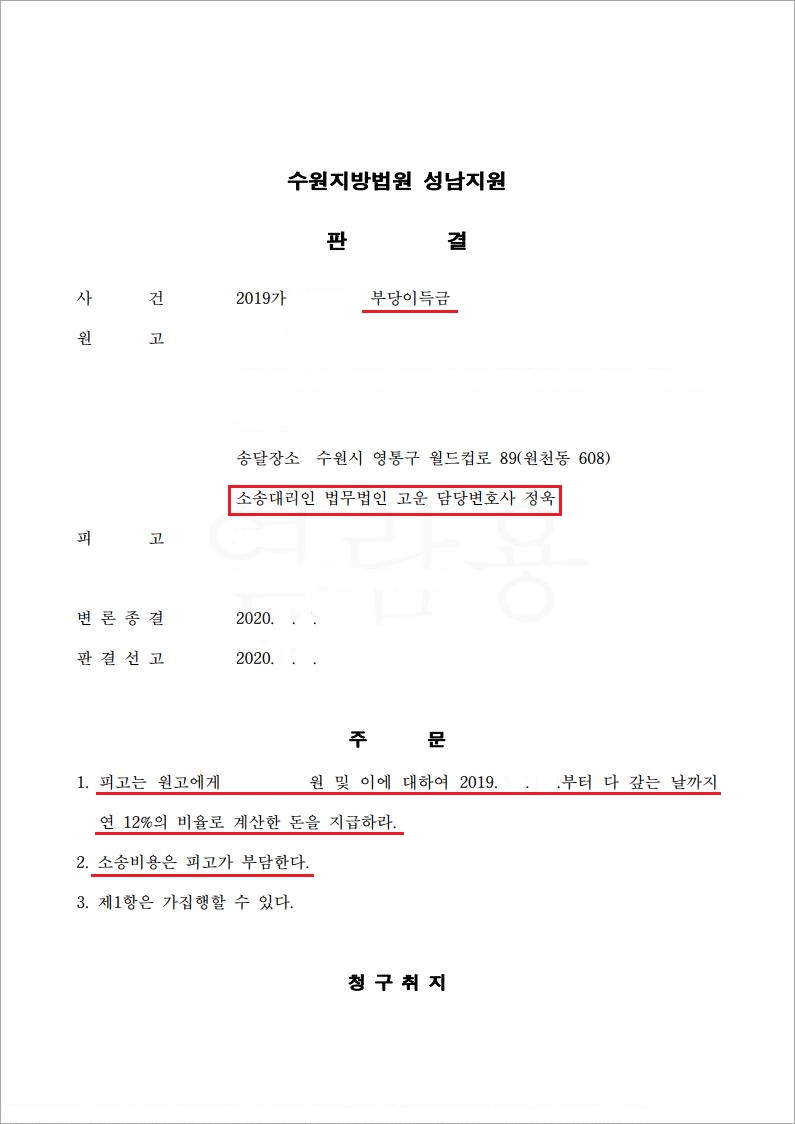 법원 재판부는 법무법인 고운의 주장을 모두 받아들였고, 결국 피해금액 전부를 반환하라는 판결을 이끌어 냈습니다.