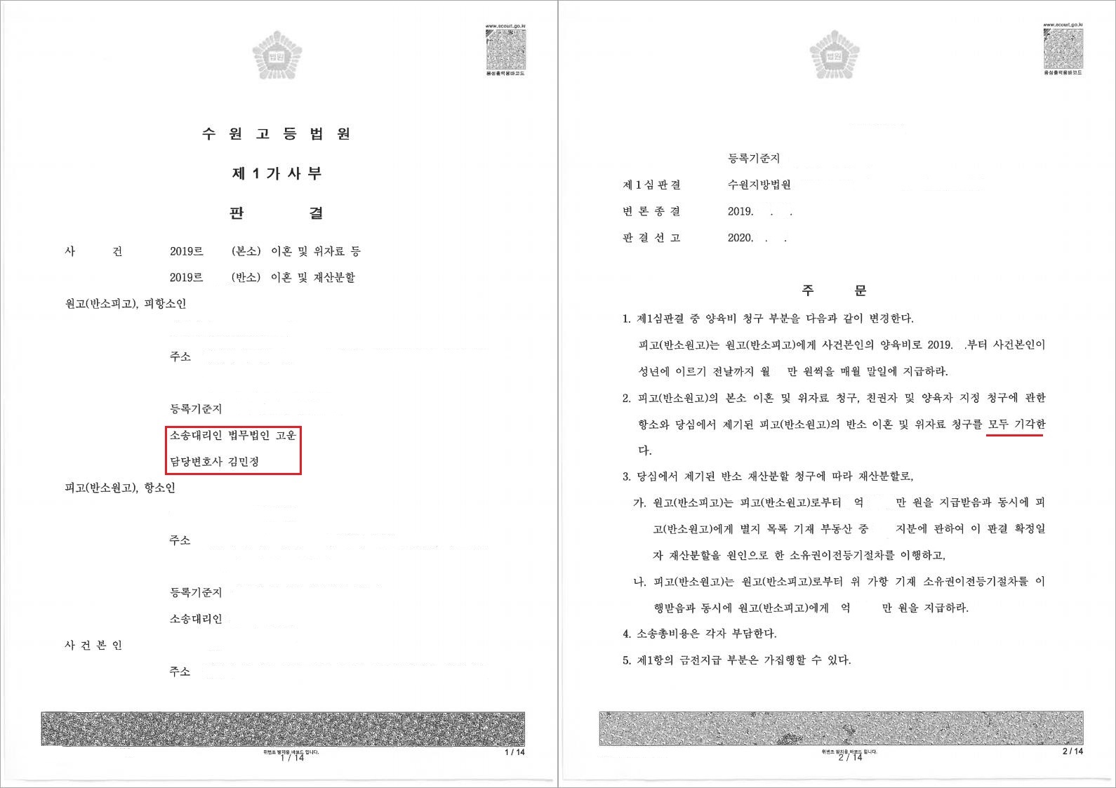 저희 법무법인 고운은 의뢰인 A씨를 대리하여 배우자 B씨를 상대로 이혼 및 위자료 등 소송을 진행하였습니다. 의뢰인은 1심에서 만족스러운 판결을 받아 항소를 하지 않았으나, A씨의 배우자 B씨는 위자료 및 재산분할에 이의를 제기하여 항소하였고, 이에 저희 법무법인 고운에서는 항소심 사건도 맡아 진행하게 되었습니다.