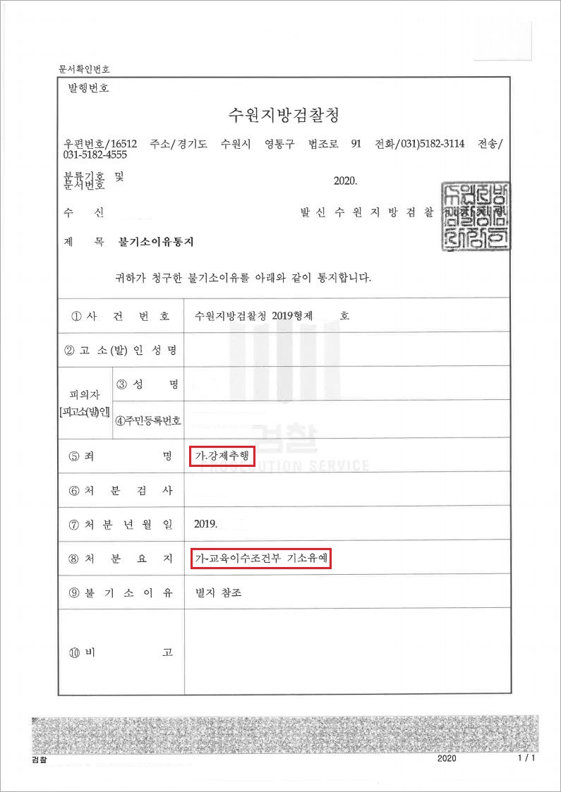 검찰은 법무법인 고운 변호인의 의견을 반영하여, 결국, 의뢰인 A씨에 대하여 교육이수조건부 기소유예 처분을 하면서 사건을 마무리지었고, 의뢰인은 매우 만족하였습니다.
