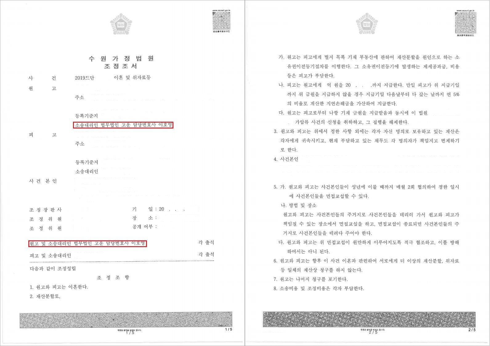 결국 의뢰인 A씨는 B씨와 이혼하며, 혼인파탄에 책임이 있는 B씨가 지급해야 할 위자료 부분까지 감안하여 많은 액수의 재산분할을 받는 것으로 조정이 성립되었습니다. A씨는 애초에 본인이 생각했던 금액인 청구금액보다 2배 이상 많은 재산분할금을 지급받는 것에 상당히 만족감을 표하셨습니다.