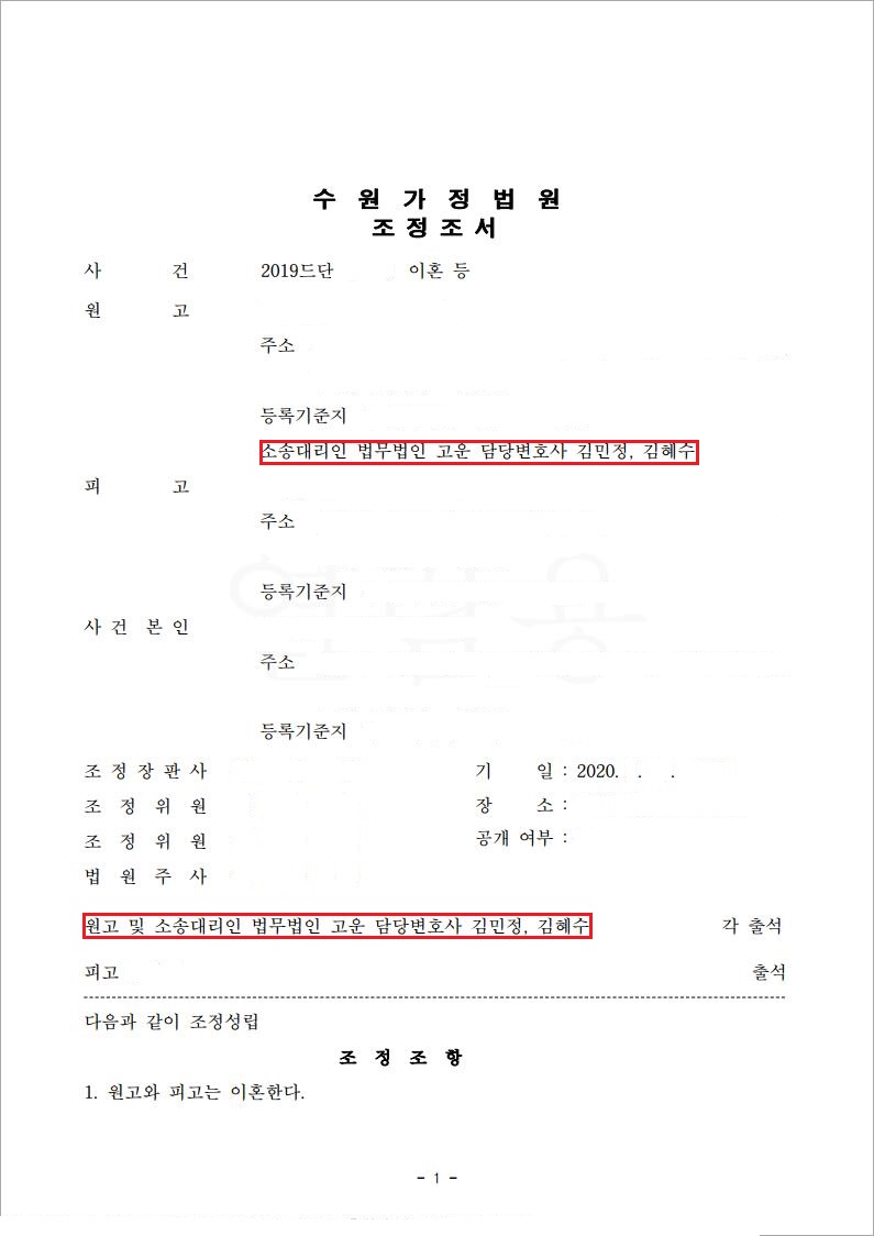 의뢰인 A씨는 미성년자인 자녀뿐만 아니라 성년인 자녀들까지도 부양하고 있었으므로, 자녀들과 생활할 주거지의 안정과 재산분할 비율이 매우 중요한 부분이었습니다. 이에 저희 법무법인 고운은 조정 절차를 통하여 재산 형성에 관한 A씨의 기여도 및 자녀들의 생활 환경 등 부양적인 부분에 관하여 적극 주장하였고, 결국 부부의 유일한 재산인 B씨 명의의 아파트를 A씨가 취득하기로 하였으며, 부부 공동 재산 중 약 90% 상당을 A씨가 취득하기로 하는 내용으로 원만히 조정을 성립시켰습니다.