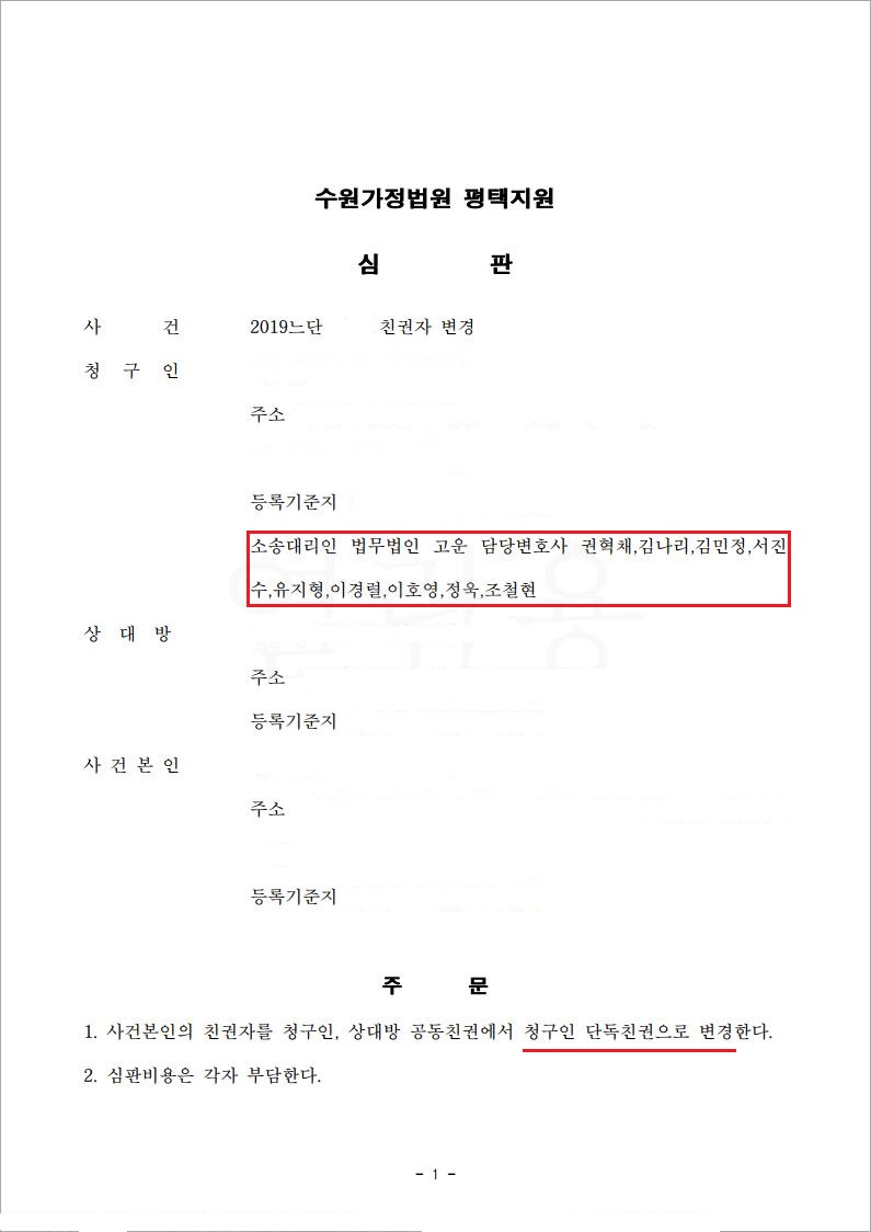 본 사건의 경우 자녀의 친권자가 공동친권자로 지정되어 있어 친권자를 단독친권으로 변경하는 것이 필요하였는데, A씨의 전배우자인 B씨는 A씨에 대하여 매우 적대적인 입장으로 친권자 변경에 B씨의 협조를 전혀 받을 수 없는 상황이었습니다. 이에 저희 법무법인 고운은 자녀의 복리를 위하여 단독친권자로의 변경이 반드시 필요한 사유에 대하여 적극 소명하였고, 그 결과 조속한 시일 내에 친권자 변경 결정을 받을 수 있었습니다.