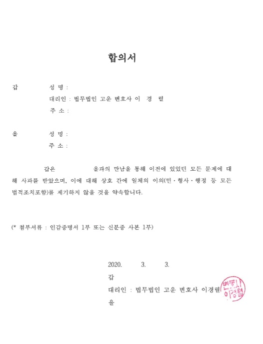의뢰인 A씨와 B씨는 합의의 자리를 마련하여 상호간에 오해를 풀게 되었고, A씨는 합의금을 지급하지 않고, 사건이 조기에 종결되는 결과를 받고 매우 만족하였습니다.