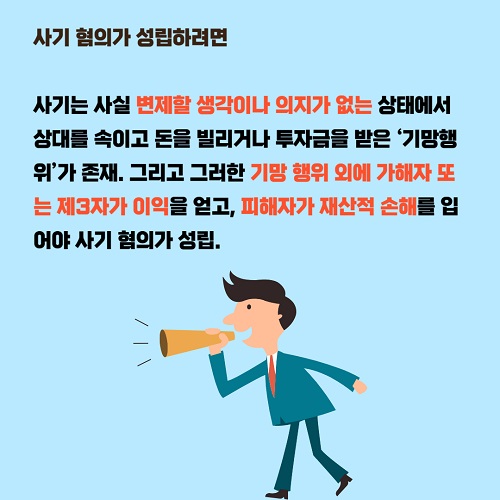 흔히 많은 분들이 돈을 빌려서 갚지 않거나, 투자를 받고 수익금을 주지 않는다면 그것은 사기가 아니냐는 생각을 합니다. 하지만 사기는 그렇게 단순히 성립하는 혐의가 아닙니다. 사기는 사실 변제할 생각이나 의지가 없는 상태에서 상대를 속이고 돈을 빌리거나 투자금을 받은 ‘기망행위’가 존재해야 합니다. 그리고 그러한 기망 행위 외에 가해자 또는 제3자가 이익을 얻고, 피해자가 재산적 손해를 입어야 비로소 사기 혐의가 성립합니다.