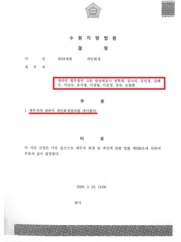 그 결과 A씨는 원금의 약 65%만을 36개월간 변제하는 개인회생 개시결정을 받아 약 1,100만원의 채무가 탕감되는 성과를 얻었습니다.
