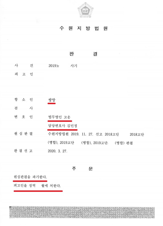 재판부는 저희 법무법인 고운 주장에 대하여, 상당부분 인정하여 의뢰인 A씨의 항소를 받아드려 원심 선고를 파기하고 또한 1심 선고에 대해 감형하여 선고하였습니다.