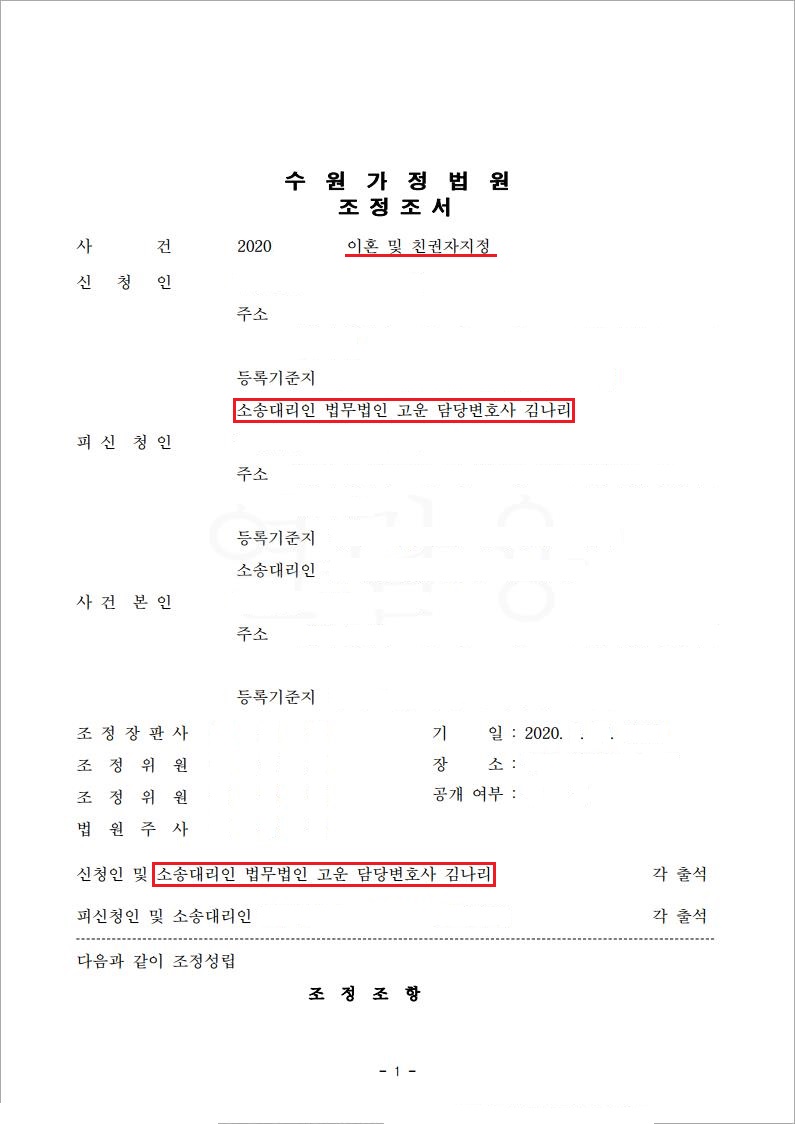 의뢰인 A씨는, 배우자 B씨와 원만히 이혼 절차를 마무리하되 이혼 이후 배우자 B씨가 다시 재산분할 청구를 하는 등 다시 분쟁이 생기지 않기를 바랐고, 이에 저희 법무법인 고운은 조정절차를 통하여 향후 분쟁의 소지가 없도록 합리적인 합의안으로 원만히 이혼 절차를 마무리하기 위하여 조정신청을 하였습니다.